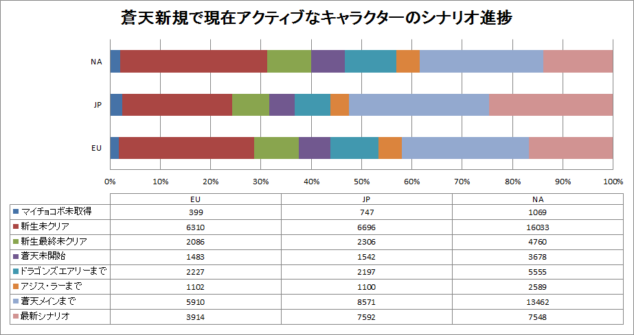 零式のリリースや禁書装備の解禁はパッチ3.05(7/21)で、この時期プレイしていれば、現在休止していても今回のアクティブキャラクター数にはカウントされる。なので、継続的にプレイしていて、シナリオを追いかけているユーザーの3.1のプレイ状況として確認できるのがこの項目。