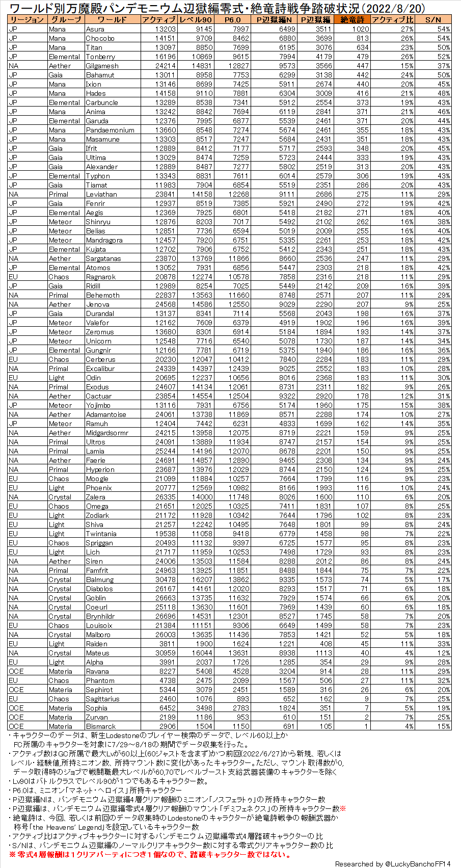 絶竜詩戦争の踏破確認はデータ収集時のLodestoneのキャラクターページの表示ジョブの装備武器が絶竜詩戦争の報酬武器であるか、着けている称号が報酬称号の「the Heavens' Legend」であるかで判断している。絶竜詩戦争を踏破していてもLodestoneの表示ジョブが違ったり、称号を付けてなかったりしたらカウントされない。なお、確認可能なものは出来るだけ広く拾うために前回の調査でカウント基準を満たしていたキャラクターは今回絶武器もってなかったり別の称号にしていても今回もカウントに加えている。それでも実際の踏破者数はこの数字より多いはずだが確認できるキャラクターだけで数えると上記のようになっている。