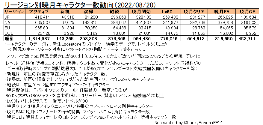 アクティブキャラクターの判定などの詳細などは「Lodestone国勢調査のよくある疑問」という記事にまとめてあるので参照されたし。