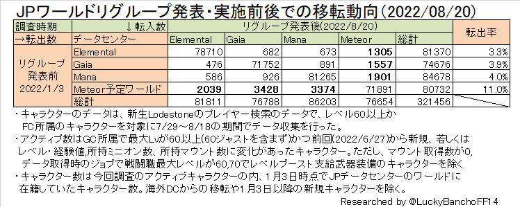 今回のワールドリグループで残留したワールドの人はフレンド100人いたら3,4人くらい別DCに行ってしまった計算になるが、Meteor再編組の人はフレンドの10人に1人は別DCに行ってしまった・・・と言えば状況の差は伝わるだろうか。