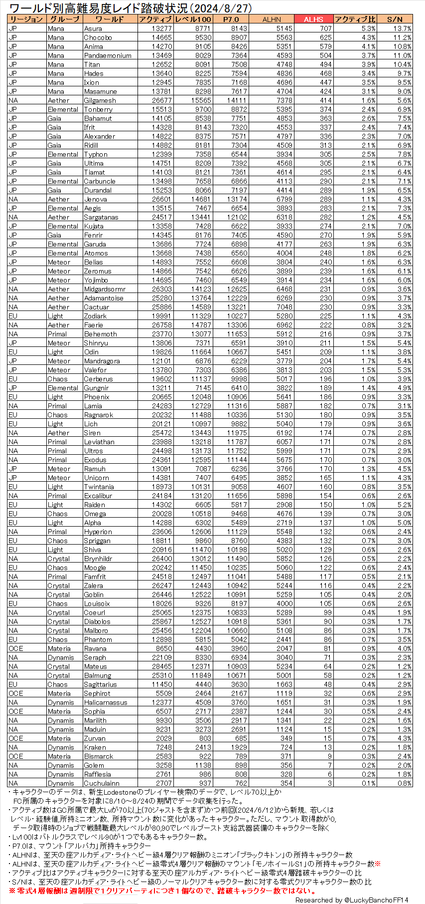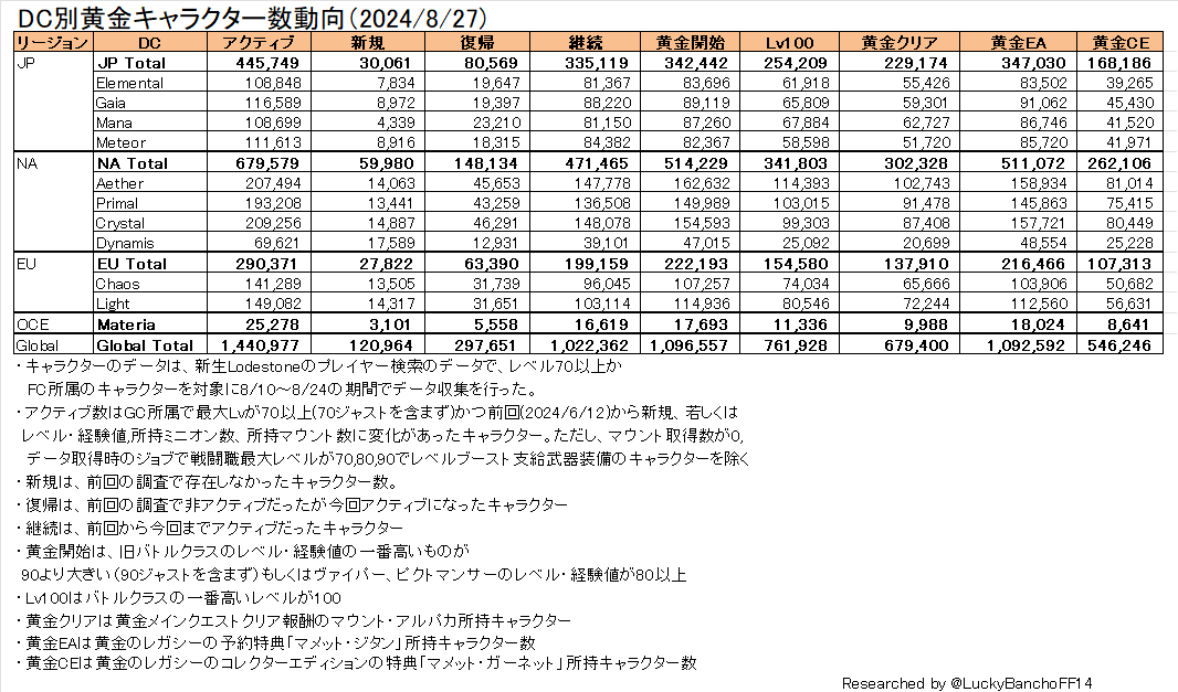 前回の更新は黄金のレガシーリリース前の6月12日。そこから2か月強の中でキャラクターデータに変化のあったものをアクティブキャラクターとして集計している。