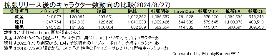 暁月と比較して黄金のアクティブキャラクター数は多いが、新規、継続、拡張EAの方は暁月の方が多い。全体のアクティブキャラクター数の違いを考えれば割合としては結構特徴が出ている。