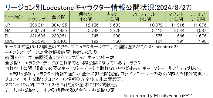 また、キャラクター情報は公開されていてもプロフィール情報(装備やスキルレベルなど)、ミニオン、マウントの所持状況などどれが一つでも非公開だとLodestone国勢調査の集計に必要なデータが取れない。この状態を表では「何れか非公開」と表現している。