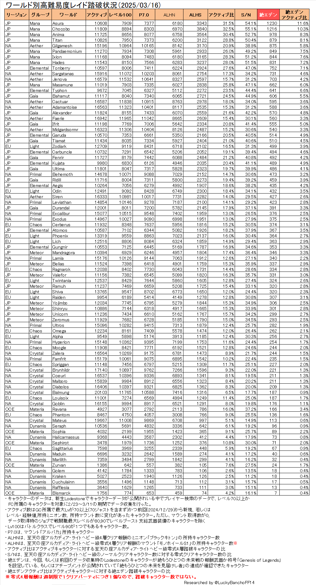 Lodestoneのデータからクリア形跡が確認できる分は最大限フォローしているが、絶エデンをクリアしていても、武器や称号を装備せず、アチーブメントも非公開のキャラクターも存在はするはずなので参考値ということでご理解いただきたい。
