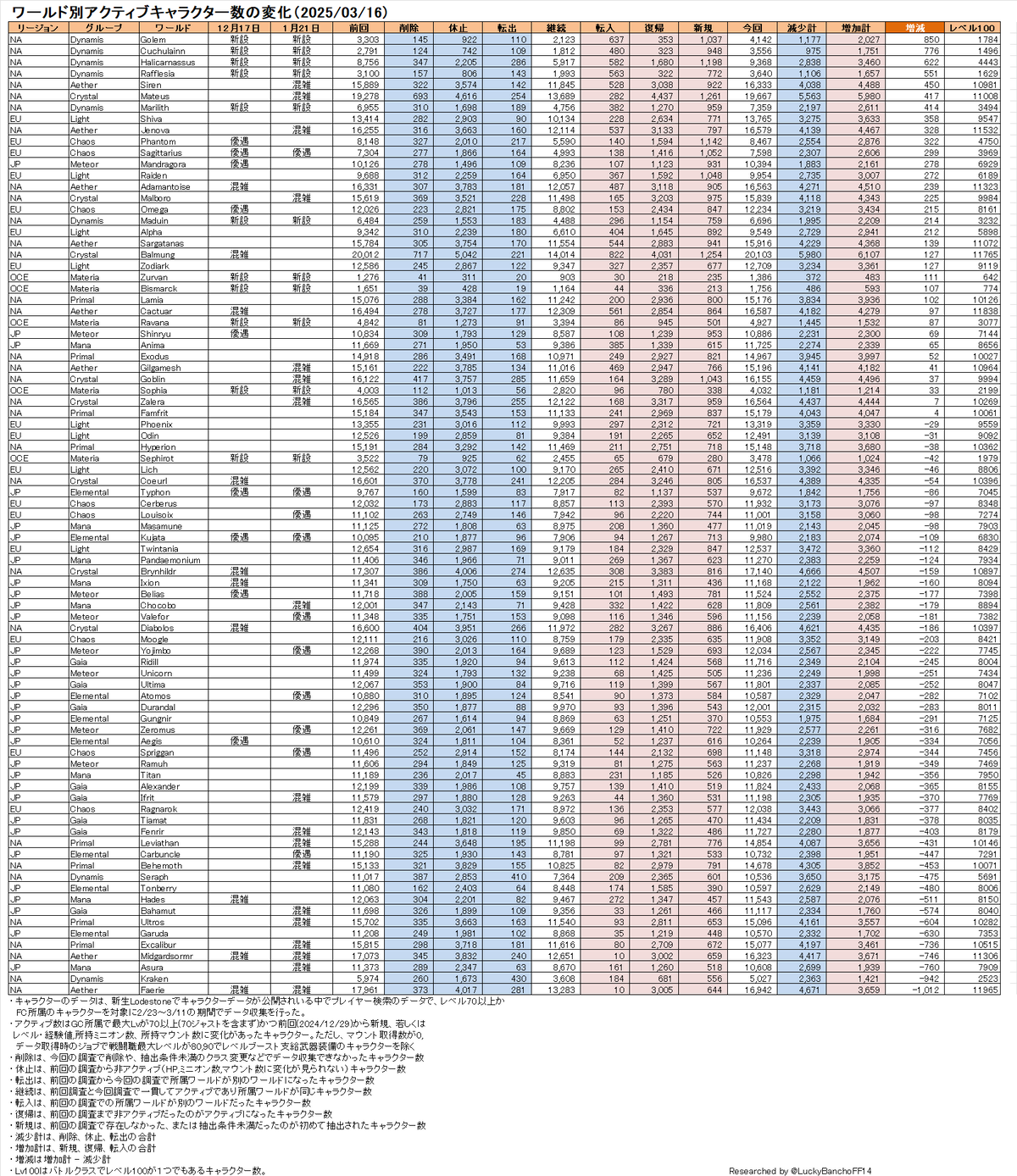 ワールド別の人口動態も見てみよう。表は増減の大きい順にソートしている。Googleのスプレッドシート版にシートを追加する形で公開しているので、気になる人はいろんな切り口で見て欲しい。